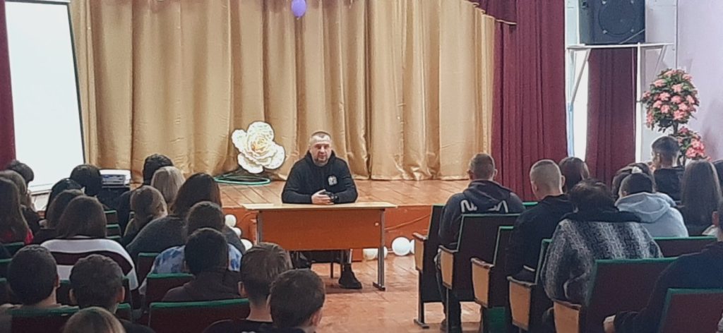 Сергій вже встиг побувати на війні та зустрітися зі смертю. Це людина сильної волі, міцного характеру, упевнений у собі, справжній патріот України. З глибоким сумом та болем в очах  ділився з учнями спогадами, розповідав школярам, що пережив за час, проведений на Донбасі, про солдатську єдність, братерство. Чоловік своїм прикладом показав, що не тільки словами можна любити свою Батьківщину, але і вчинками доводити це. Говорили про військові будні зі сльозами на очах, а в залі панувала тиша…
